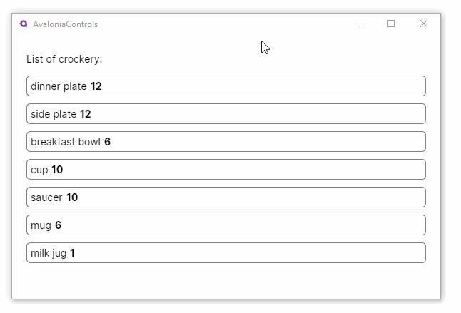 This example binds an observable collection of crockery items to an items control, where some custom layout and formatting is provided by a data template: